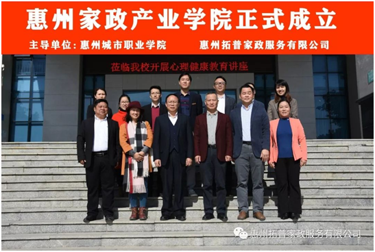 2019年12月4日,由惠州市教育局、惠州市人力資源和社會保障局、惠州市商務局主管,惠州城市職業學院和惠州拓普家政服務有限公司共同創辦的惠州家政產業學院正式成立,并召開了第一次理事大會。